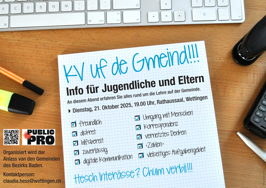 2025, um 19.00 Uhr, findet im Rathaussaal in Wettingen ein spannender Infoabend zur KV-Lehre